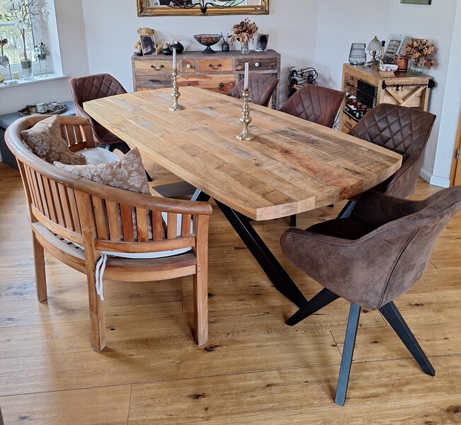 Im Farbton variierende Balken verleihen der Tischplatte ihr wunderbar uriges Erscheinungsbild. Unebenheiten und rauhe Stellen sind gewollt und machen den einzigartigen Charakter des Tisches aus. Die Platte ist gut 5 cm stark, was das Rustikale und Massive unterstreicht.