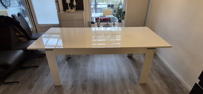 weißer Esstisch, Hochglanz, mit Einlegeplatte