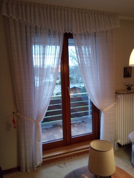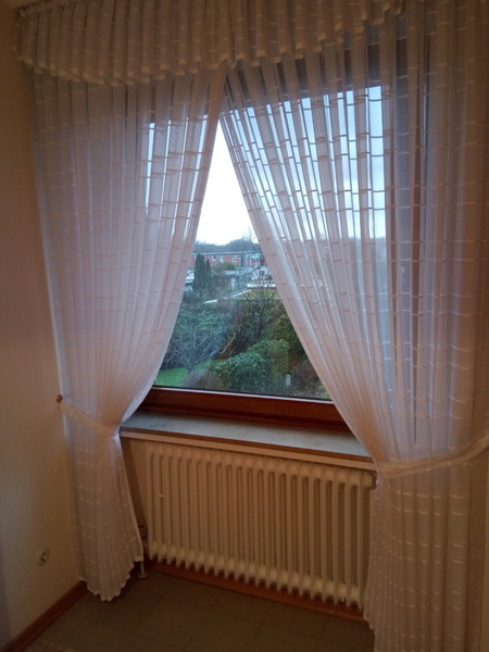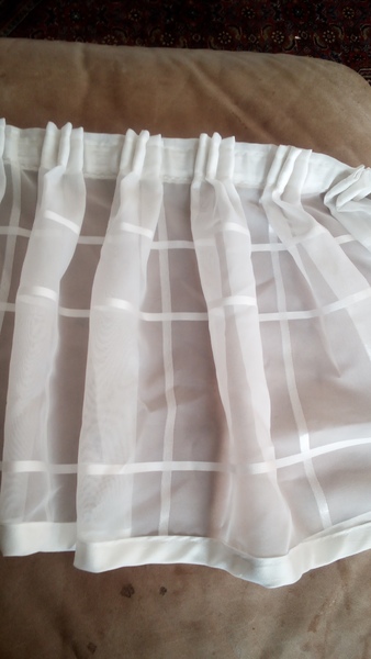 Gardine weiß. Schabracke 1.Schal ca.1,10m, 2. Schal ca.1,07m breit. Höhe ca. 2,50m. Schabracke ca.2,04m lang. Tiefste Stelle 0,37m. 23 Euro.