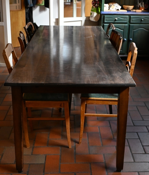 Massiver hochwertiger großer Tisch (ohne die Stühle). Guter Zustand, aber schon mit ein paar charmanten Ecken und Kanten sowie Nutzungsspuren auf der Oberfläche, aber keine Defekte. Massivholz, lackiert.
