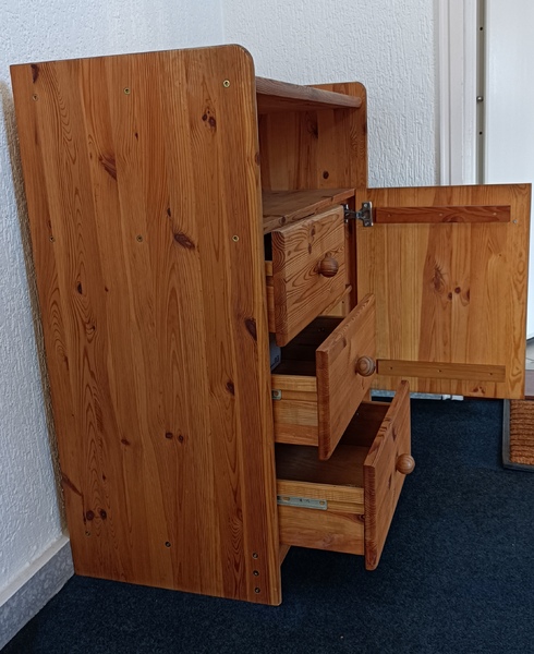 Viel Stauraum: drei Schubladen, eine Tür, ein Regalfach