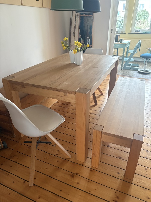 Verkaufe meinen schönen Esstisch aus Massivholz Wildbuche geölt mit passender Bank, sowie zwei Stühlen im Skandi Style.