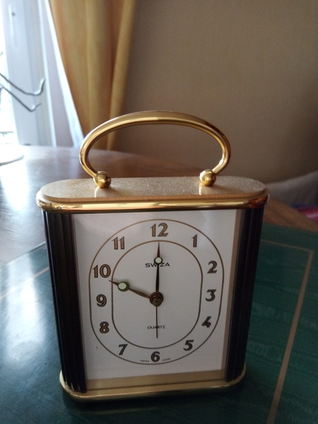 Messing Uhr Tischuhr 10,5 cm breit, ca. 3,3 tief. 12 cm hoch ohne Haken.Bei der Uhr müsste vielleicht mal eine Wartung gemacht werden. Es ist eine elektrische Uhr. Privat Verkauf kein Rückgnahme