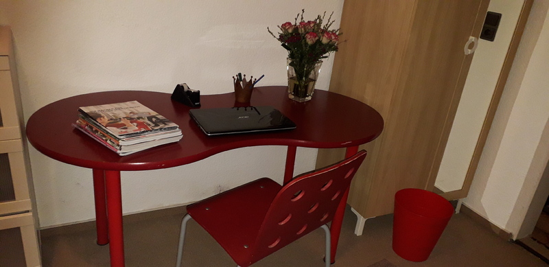 Ich biete einen roten Schreibtisch mit Stuhl.