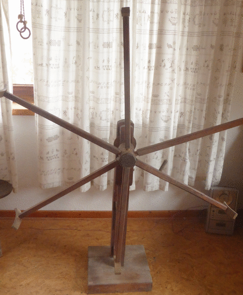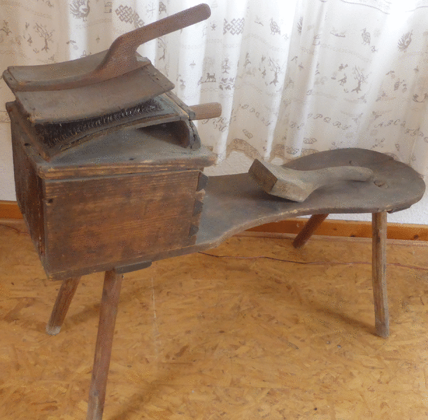 Das Spinnrad ist zerlegt. Auf der Kämmbank wird die Schafwolle ausgerichtet, mit der Haspel die gesponnene Wolle aufgewickelt.