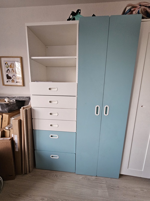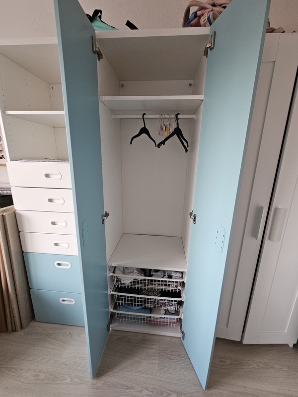 Angeboten wird ein Stuva/Fritids Kinderkleiderschrank in blau und weiß (siehe Fotos). Der Schrank wird wegen Umzug verkauft und befindet sich in einem sehr guten gebrauchten Zustand. Die Maße sind 60x50x192 cm (LxBxH). Der Schrank muss selbst abmontiert und abgeholt werden. Bei Interesse gerne melden.