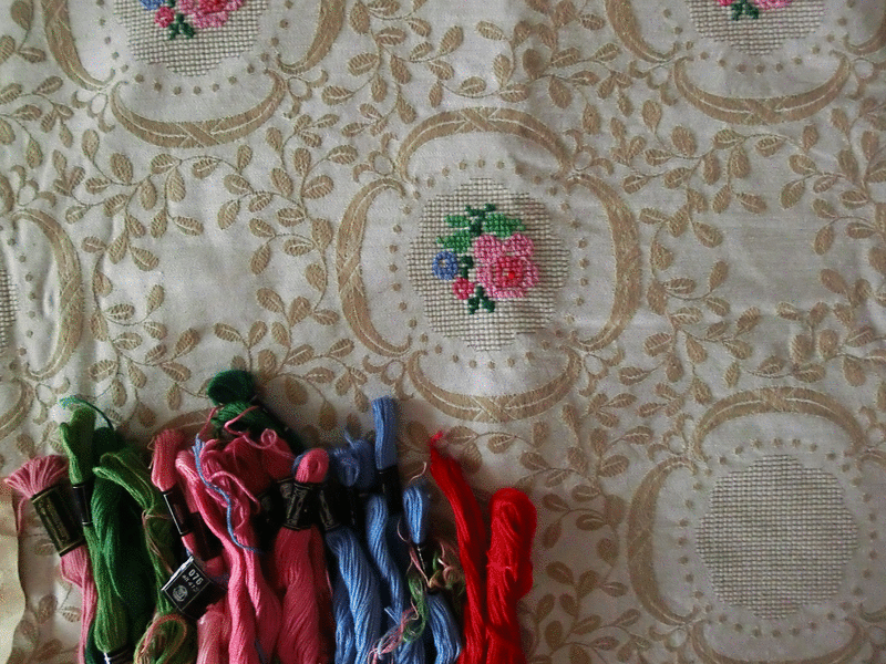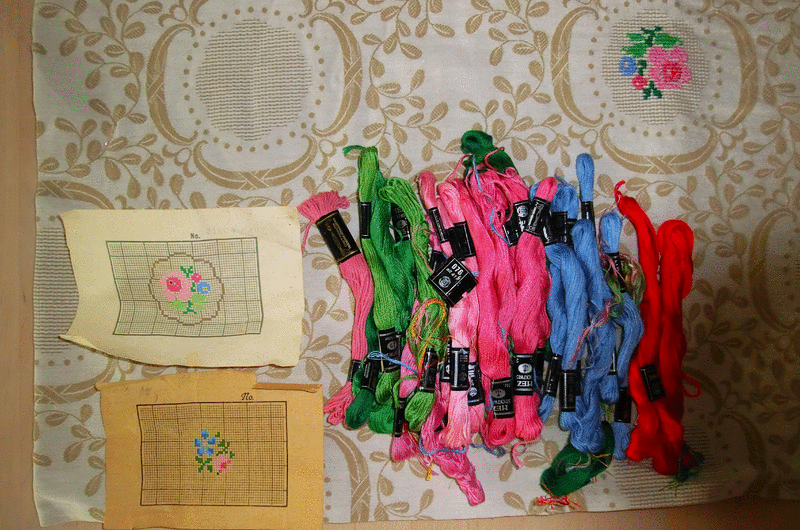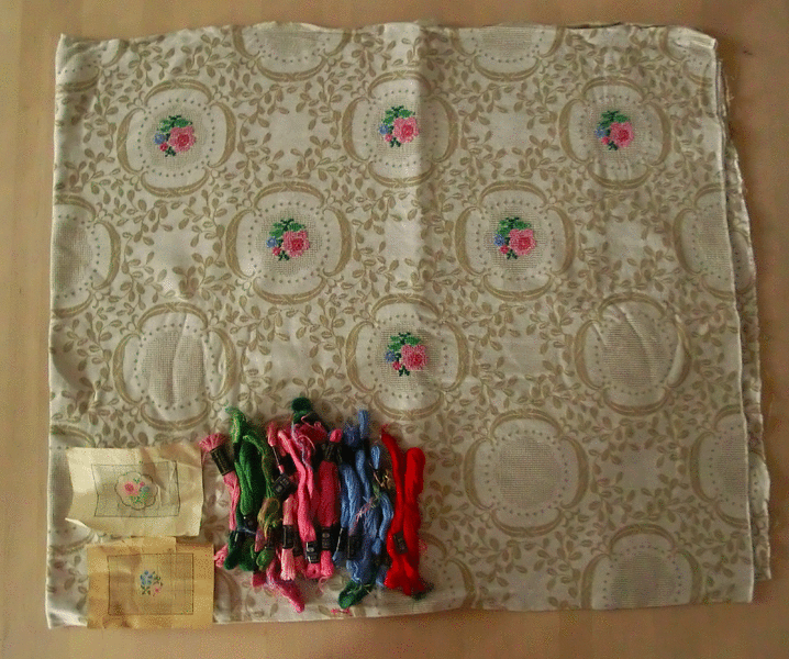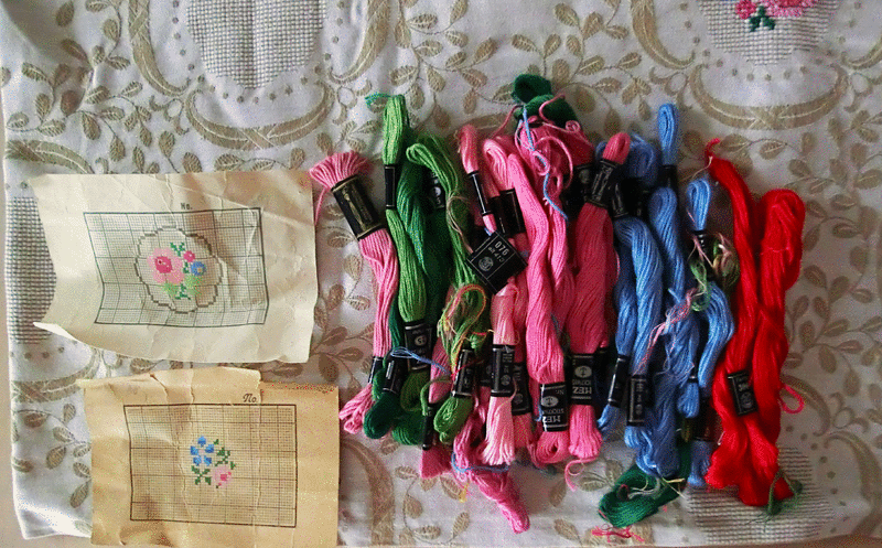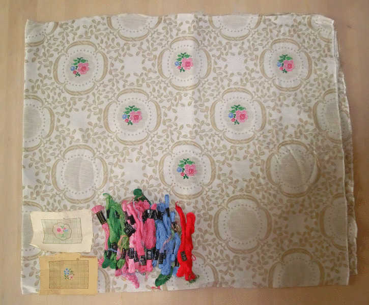 Verkaufe aus Auflösung die angefangene Stickdecke - Kreuzstich und Stickgarn mit Vorlage aus den 60er Jahren.