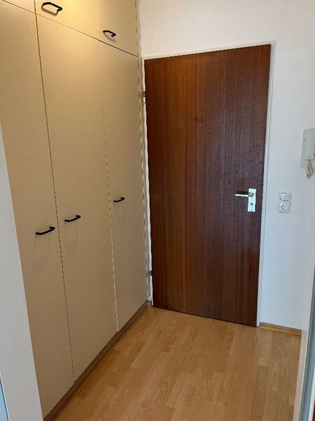 Durch einen kleinen Flur mit Einbauschrank gelangt man in das Duschbad mit Waschmaschinenanschluß und in das große Wohn-/Schlafzimmer, welches mit Laminat ausgelegt ist.