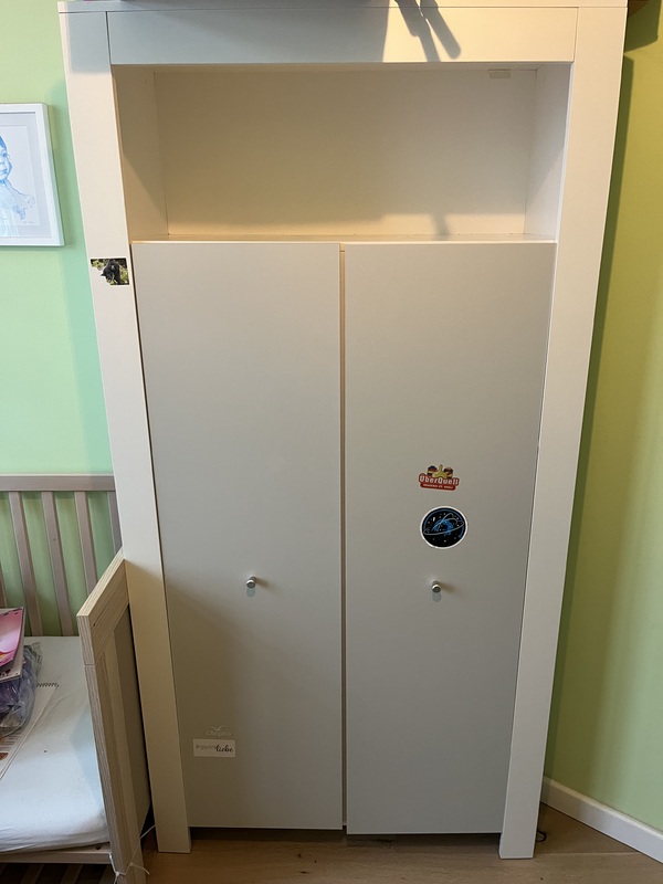 Sowie Kinderzimmer Schrank ca 55x95x185, rechts mit 3 Regalbretter, links mit 1 Regal und 1. Stange