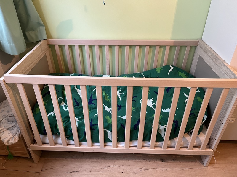 Kinderbett, Marke: Wellemöbel. Maße 75x145x85 BxLxH, inklusive Matratze von guter Qualität. Das Bett ist in 4 Höhen verstellbar daher für Baby- bis zu Kleinkind Alter.