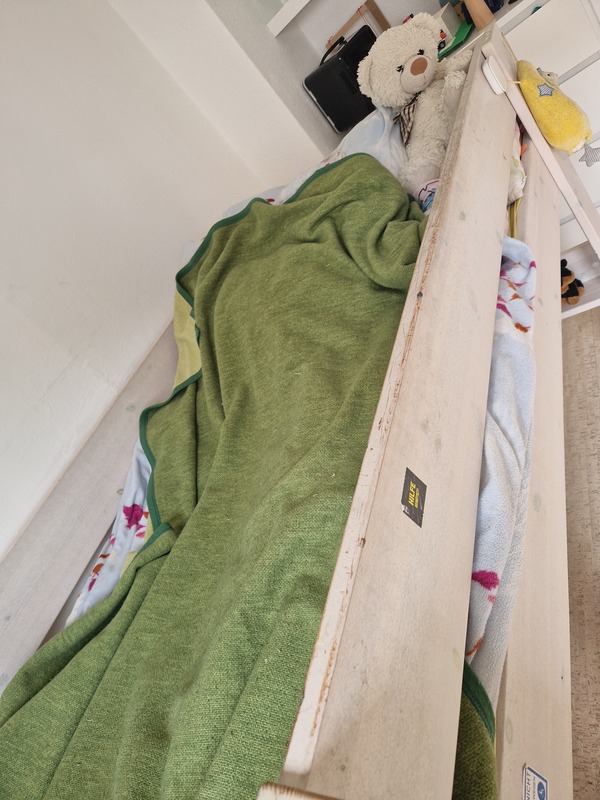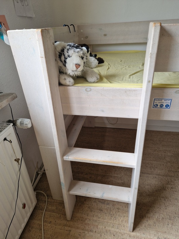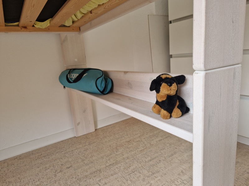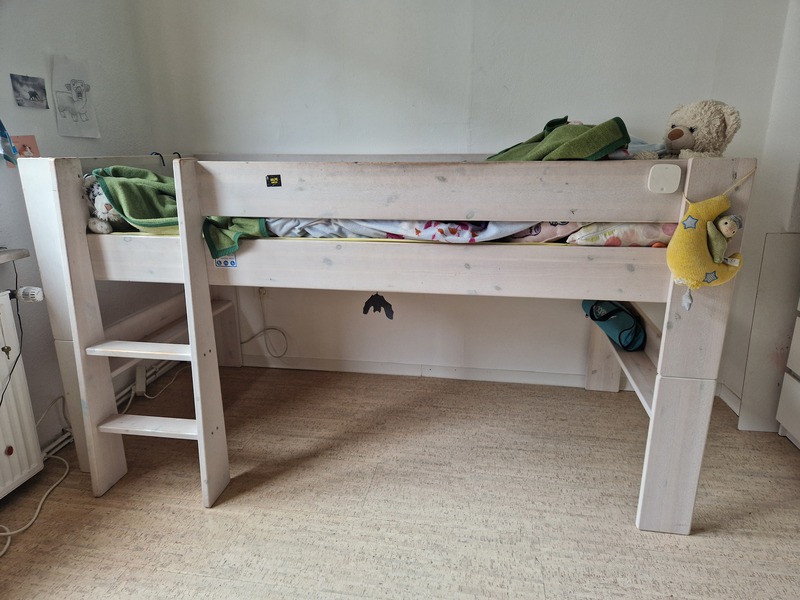 Es ist variabel als niedriges Hochbett mit Platz darunter oder als normales bodennahes Bett nutzbar. Inklusive blauer Matratze 90 x 200 cm.