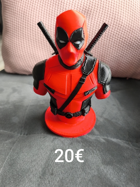 Zum Verkauf stehen 2 Büsten, eine von Supermann unbemalt und eine von Deadpool vierfarbig gedruckt.
