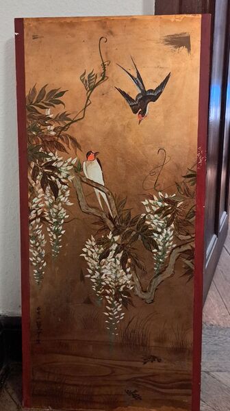 Wir möchte diese zwei asiatisch bemalten Holzpaneele mit Pfau und Schwalben verkaufen. Sie sind jeweils 86 x 39 cm groß, ca. 1 cm dick und ziemlich schwer (also wohl Vollholz?). Rückseite mit grünem Filz bezogen.