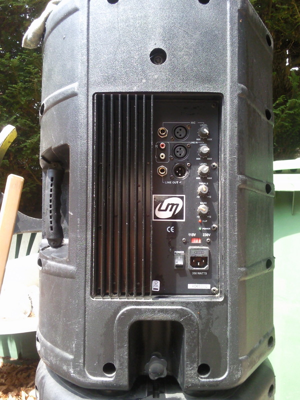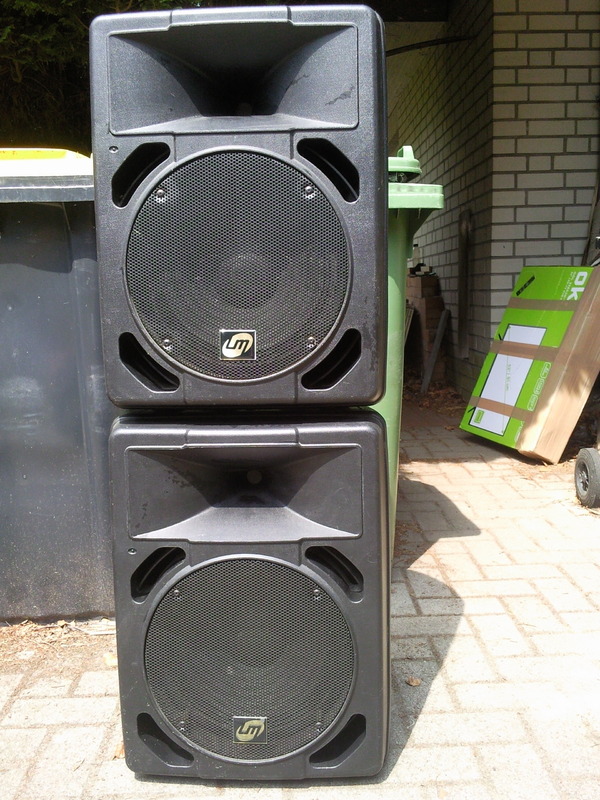 2 x Aktivbox, italienische Marke LM, 12“ Bass-Mitte / 1“ Treble-Horn, 250 W, Mic In XLR mit Levelpoti, Line In XLR und Stereo-Cinch mit Levelpoti, Line Out XLR mit Levelpoti, Bass/Treble, Clipanzeige, 115V/220V Anschluss, superflacher Frequenzgang (im Übungsraum selbst in 3 m Entfernung mit Gesangsmikro auf Boxen gerichtet kein Feedback bei mittlerer Übungslautstärke !). Stück VB 240,- Bei Bedarf passende Boxenstative vorhanden. Tel.: 01777386061