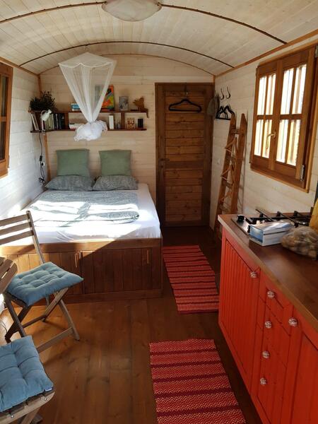 Der 2017 von einem kleinen italienischen Familienbetrieb in der Toscana in Handarbeit fertig gestellte, stabile und isolierte Holzwagen ist komplett für 2 Personen eingerichtet.