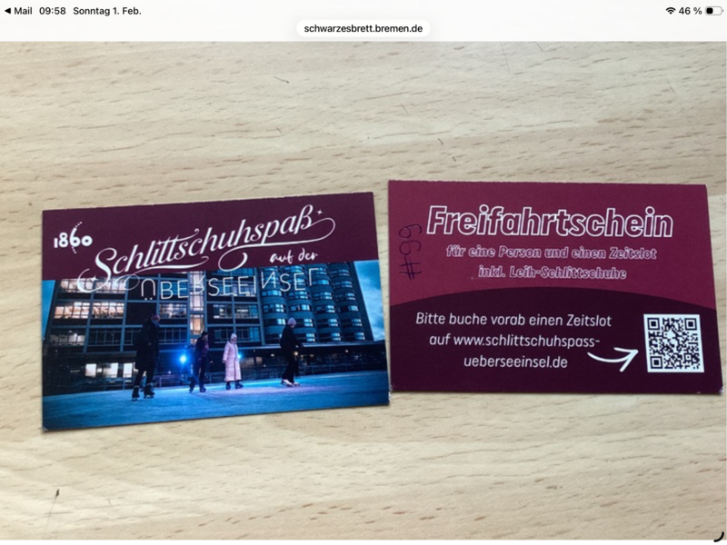Verkaufe 2x Karten für 2 Erwachsene inklusive Schlittschuh Verleih für den Schlittschuhspaß auf der Überseeinsel. Zusammen 15€. https://schlittschuhspass-ueberseeinsel.de/