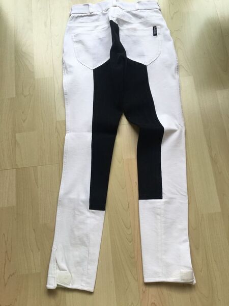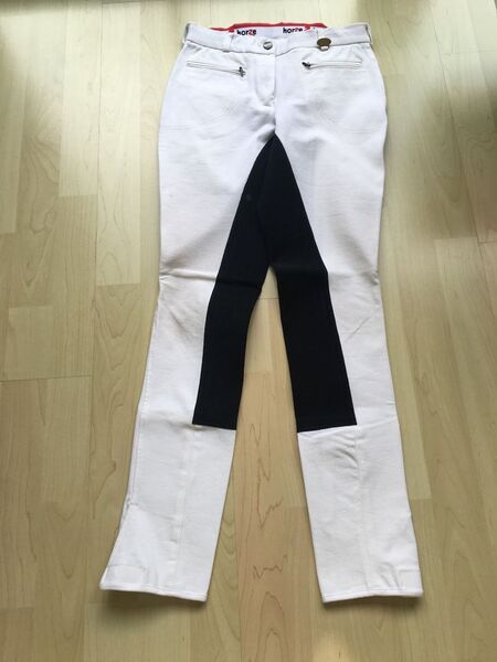 1 weiße Turnierreithose mit schwarzem Vollbesatz von Horze in der Gr. 34 zu 14 EUR.