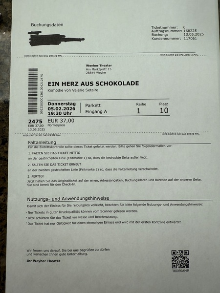 Wegen Krankheit abzugeben Top Karten für Donnerstag, 05.02.2026 Weyher Theater um 19:30 h „Ein Herz aus Schokolade“. Je Karte € 30,00