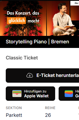 Hallo, ich habe ein Ticket für das ausverkaufte Piano Storytelling Konzert in der Glocke am kommenden Freitag abzugeben. Beginn 19:30 Uhr. Parkett, Reihe 26