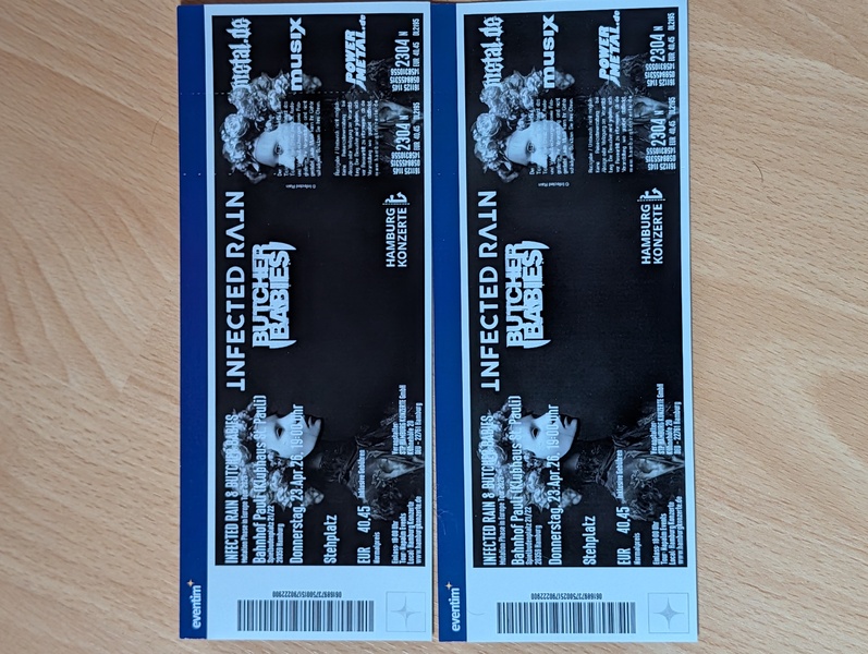 Meine Freundin und ich hatten Beide den gleichen Gedanken, haben uns gegenseitig Karten für Butcher Babies und Infected Rain in HH am 23.04.26 gekauft... Zwei Karten sind zum normalen Preis von Stück 40 Euro zu erwerben... Karten liegen in Kattenturm warm und trocken und können bei Interesse abgeholt werden...