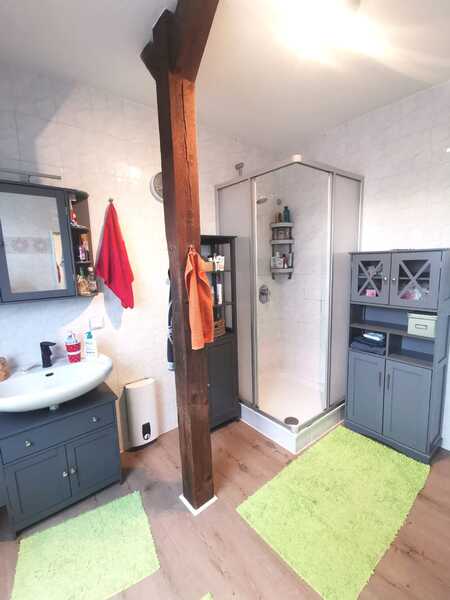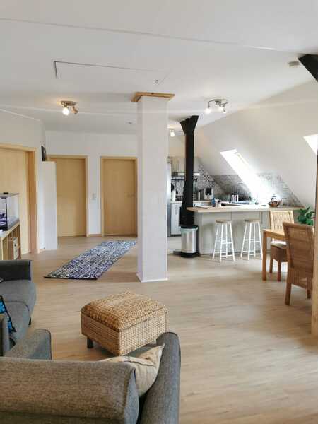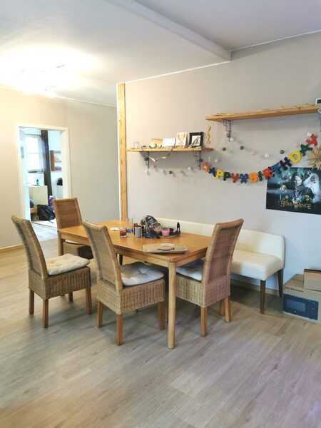 Die WG hat einen großen Gemeinschaftsraum, ein Bad mit Dusche und Waschmaschine, eine offene Küche mit Spülmaschine & Backofen plus einen Abstellraum.