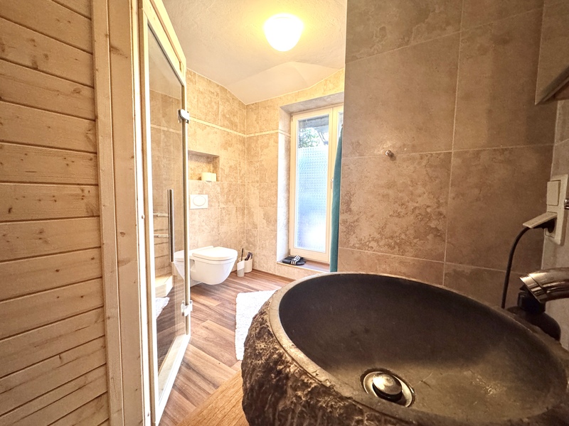 Das Duschbad mit Sauna befindet sich auf gleicher Ebene und wird nur mit einem WG- Bewohner geteilt. Ebenso hat das Souterrain einen eigenen Hauseingang.