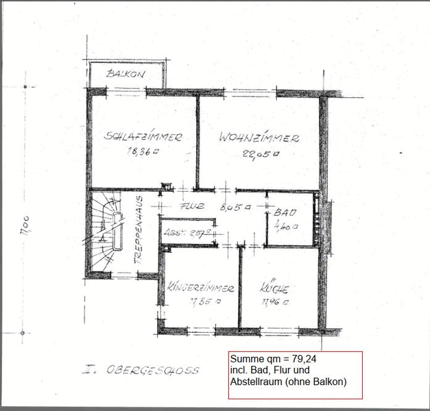 Die Fläche beträgt (incl. Flur und Abstellraum; ohne Balkonanteil) rd. 79 qm. Die Wohnung besteht aus drei Haupträumen, separater Küche, Flur und Abstellraum. Es ist eine Einbauküche vorhanden. Zusätzlich ist ein separates Vollbad mit Badewanne vorhanden. Es gibt einen Balkon mit Gartenblick in Sonnenausrichtung. Bitte beachten Sie den beigefügten Raumplan.