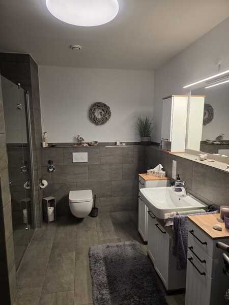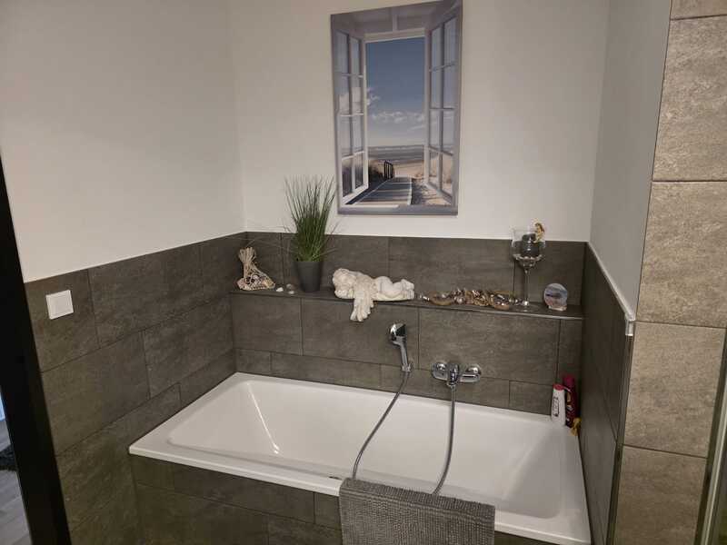 * großes Badezimmer mit Badewanne und ebenerdiger Dusche