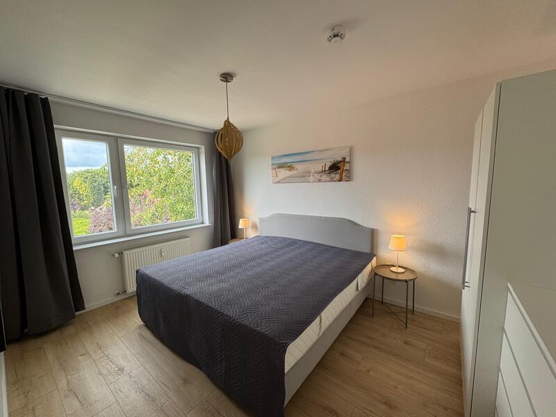 Schlafzimmer: Großes Doppelbett 2x2 Meter mit zwei unterschiedlichen Härtegraden, zwei Nachtschränke, zwei Nachttischleuchten, Deckenleuchte, Kleiderschrank, Kommode, Smart TV, abdunkelnde Gardinen